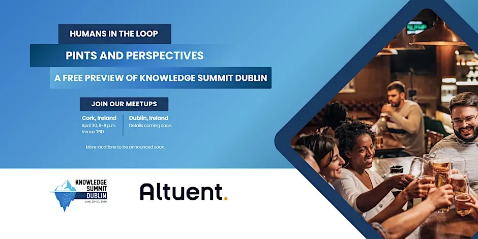 This meetup is powered by Knowledge Summit Dublin’s award-winning flipped format, with Altuent sponsoring the evening (including free pints and finger food). Expect a few short perspectives and lightning talks (15–20 minutes total) from one or two Knowledge Summit Dublin speakers, followed by relaxed peer conversation and networking.